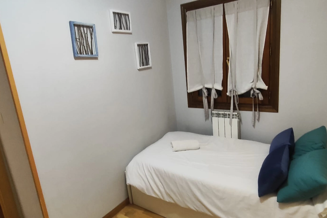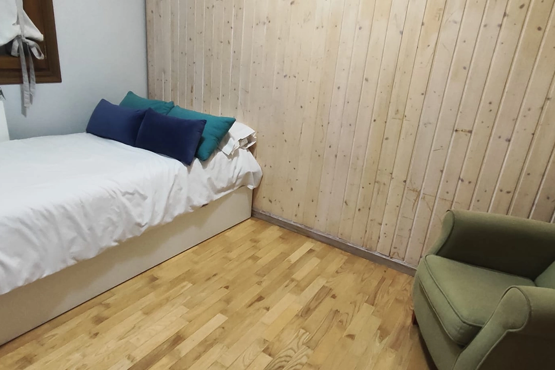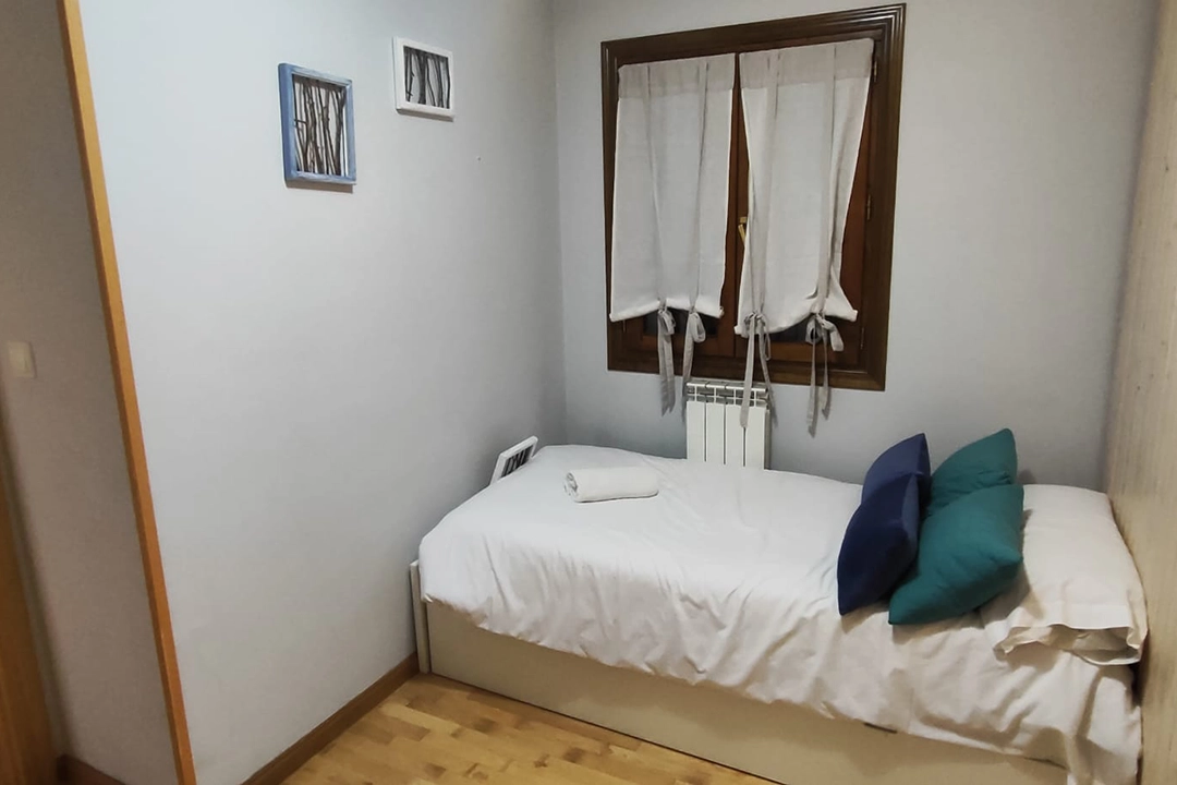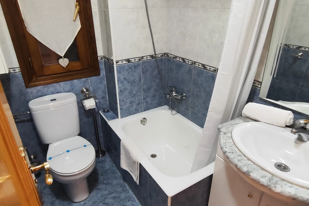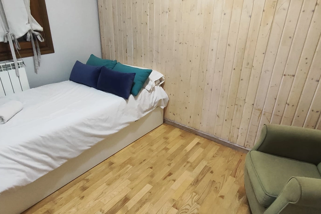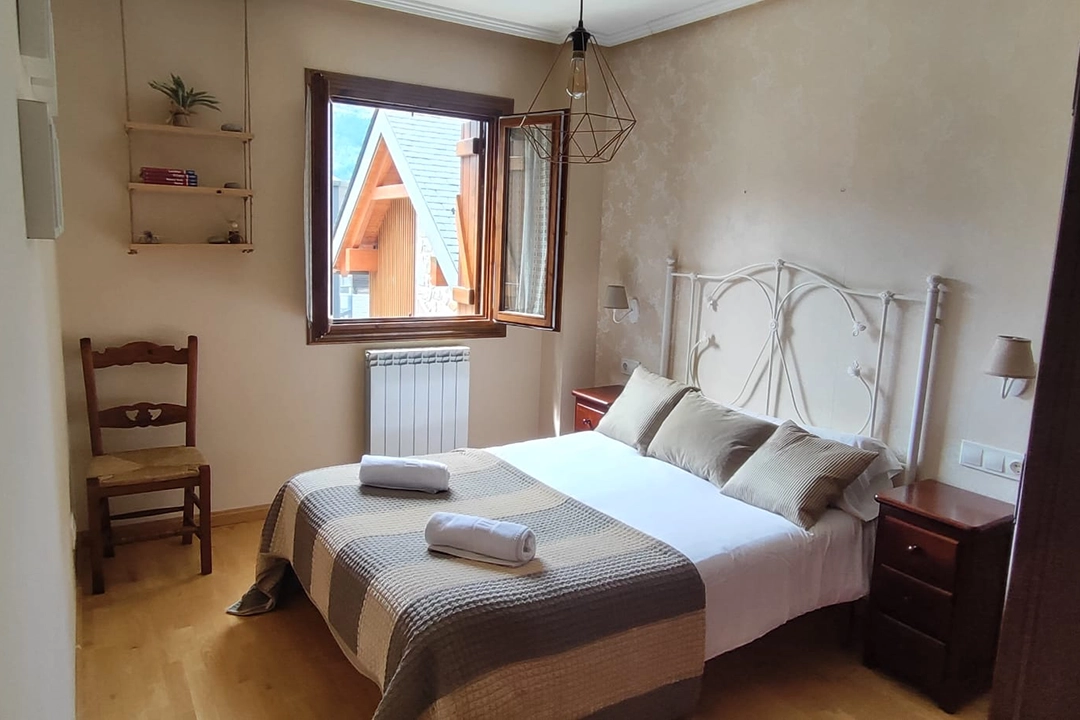 Cuenta con dos habitaciones: una con cama de matrimonio y otra con dos camas individuales, pensadas para ofrecer descanso y comodidad. Dispone de un baño completo con bañera, ideal para relajarse después de un día de montaña.