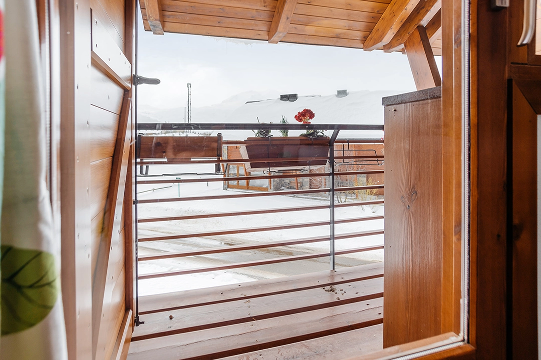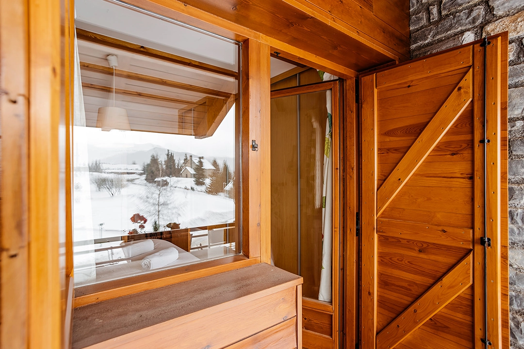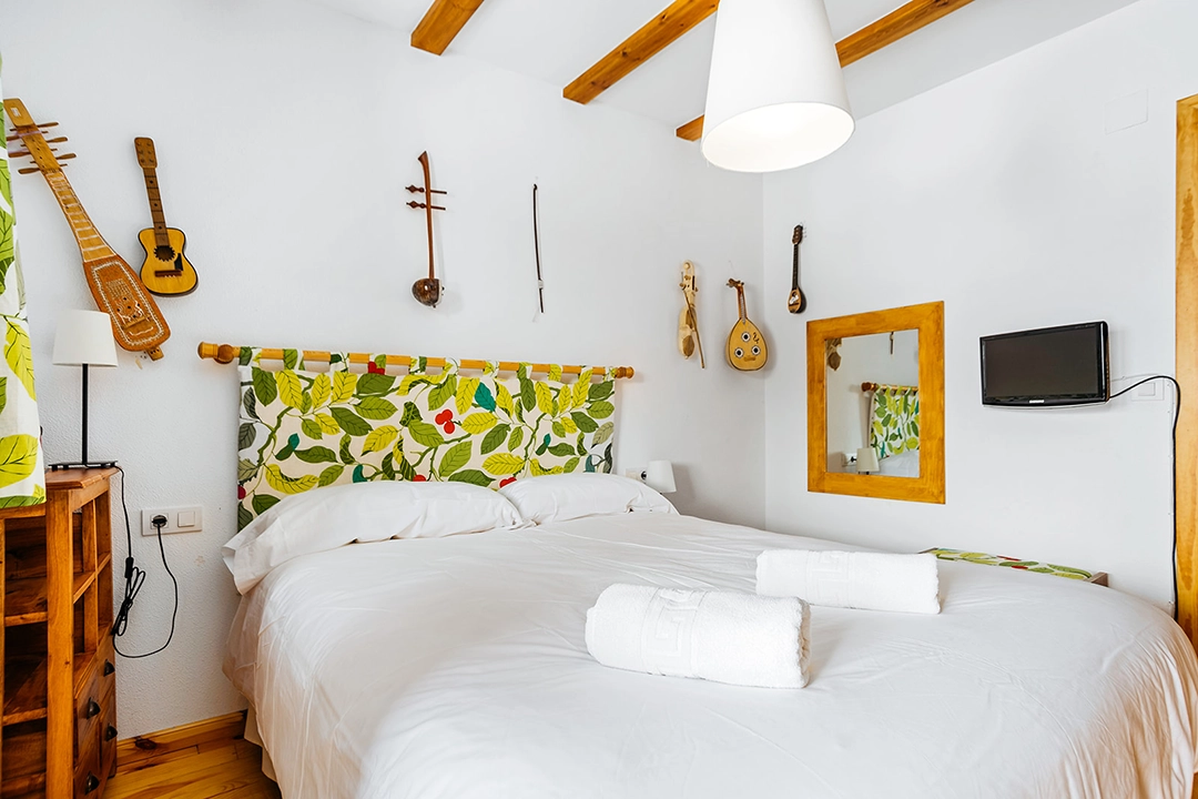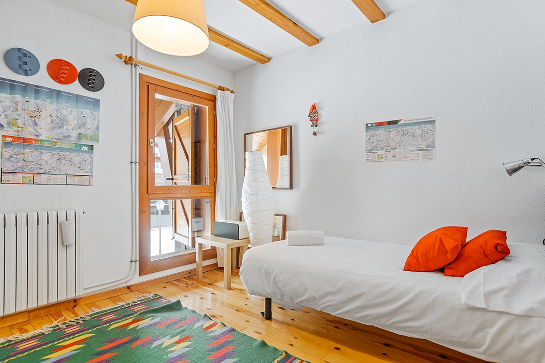 – Dormitorio con cama de matrimonio, armario empotrado, y pequeña terracita con vistas a la montaña.