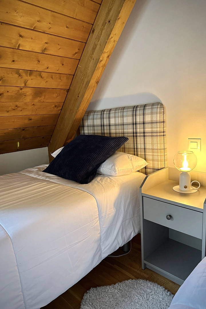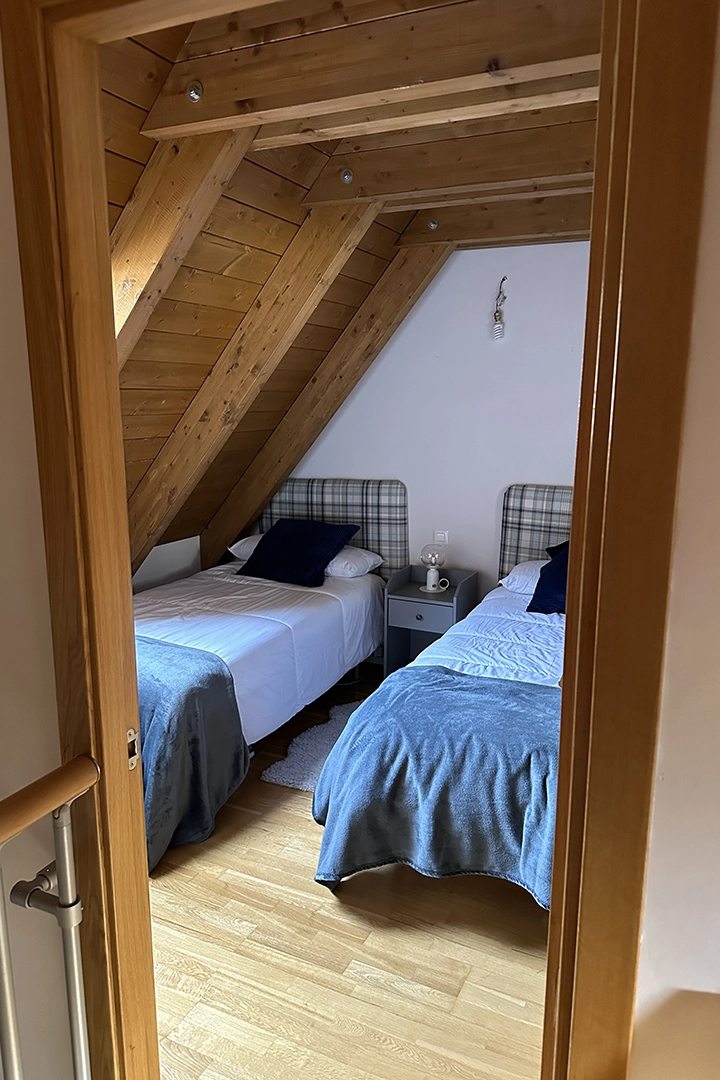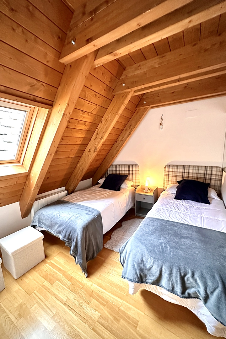 Planta de arriba: 2 dormitorios, uno con dos camas de 90 y otro con una cama de matrimonio y 1 baño.